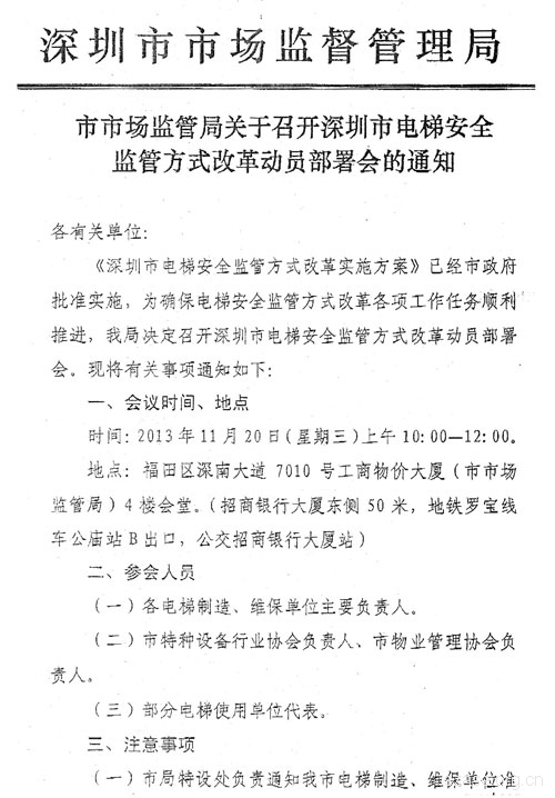 市市場監(jiān)管局關(guān)于召開深圳市電梯安全監(jiān)管方式改革動員部署會的通知