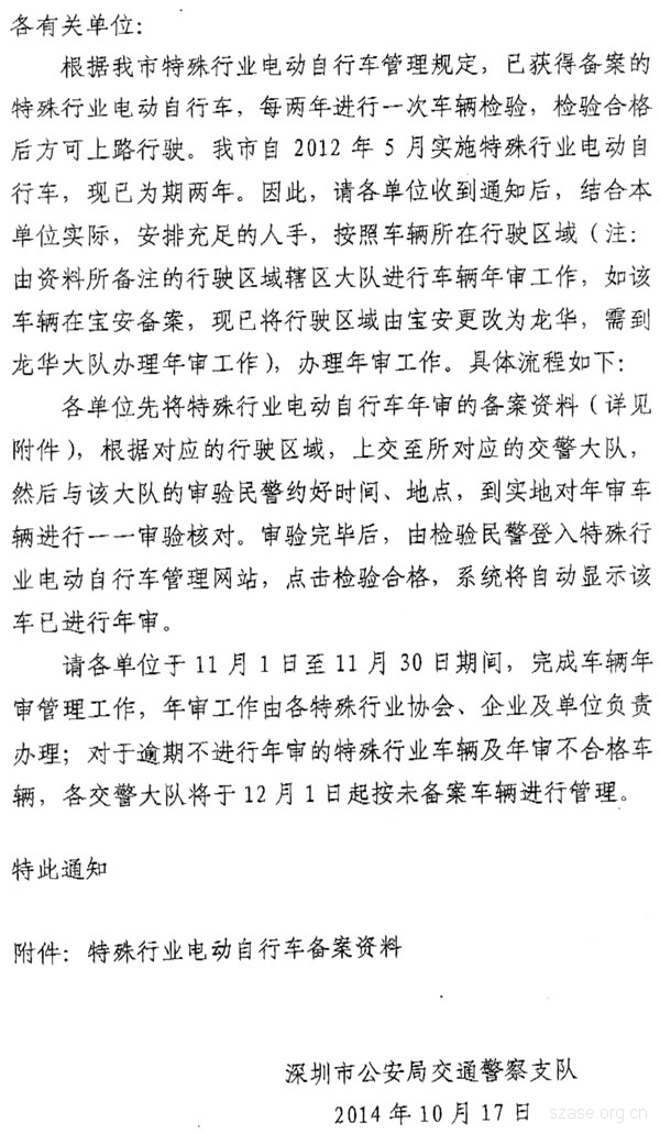 關于為特殊行業電動自行車實施年審的通知