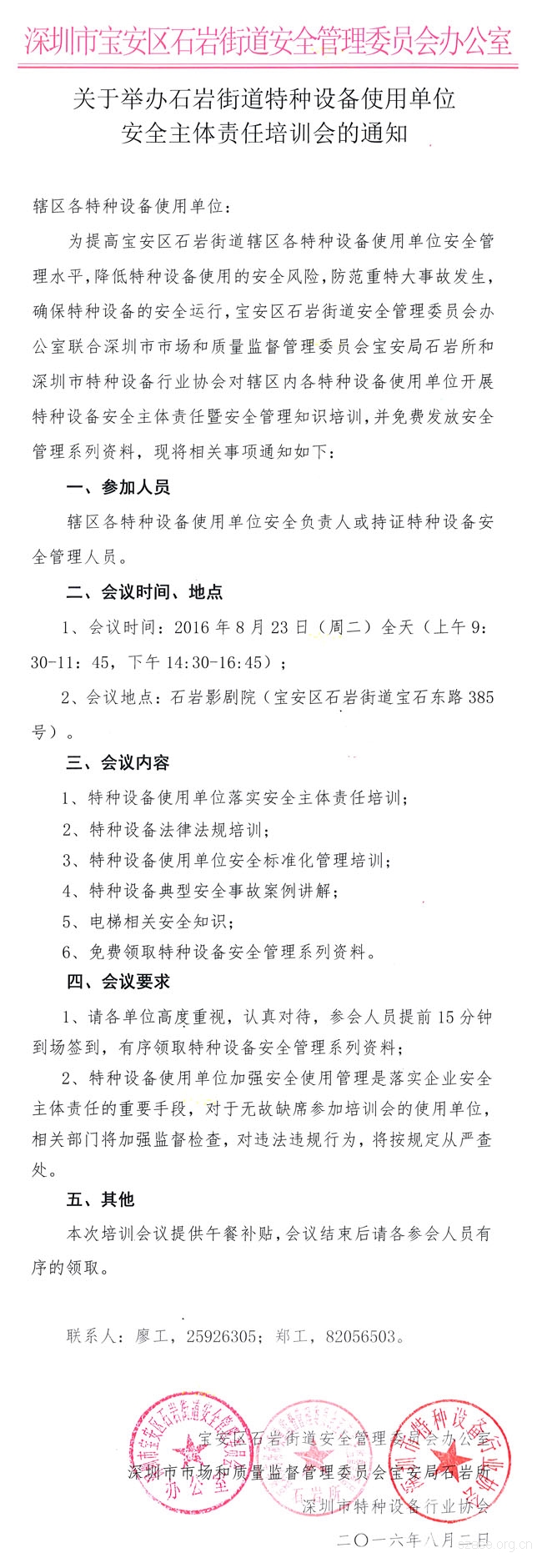 關于舉辦石巖街道特種設備使用單位安全主體責任培訓會的通知