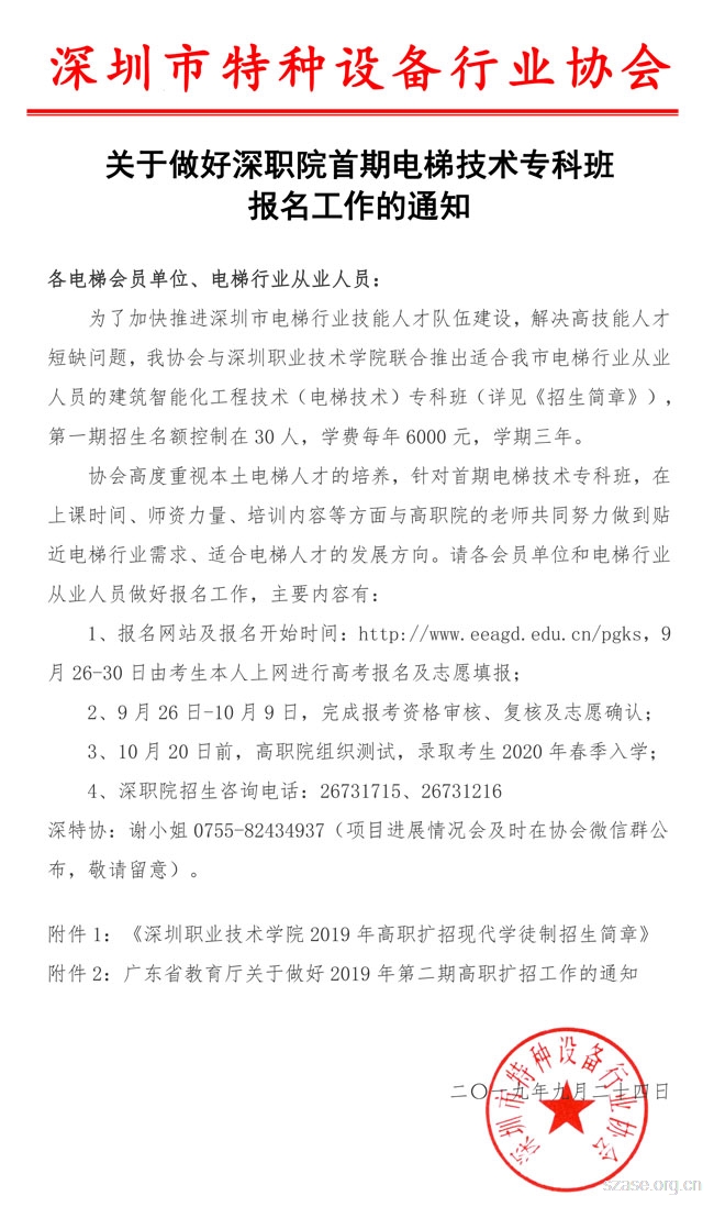 關于做好深職院首期電梯技術專科班報名工作的通知