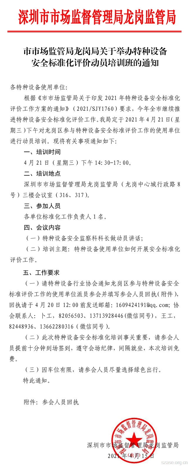 龍崗監(jiān)管局特種設(shè)備安全標(biāo)準(zhǔn)化評(píng)價(jià)動(dòng)員培訓(xùn)班通知