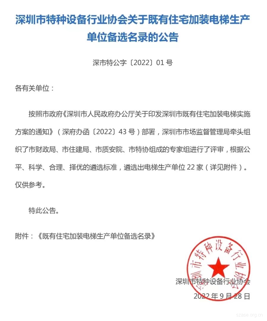 深圳市特種設備行業協會關于既有住宅加裝電梯生產單位備選名錄的公告
