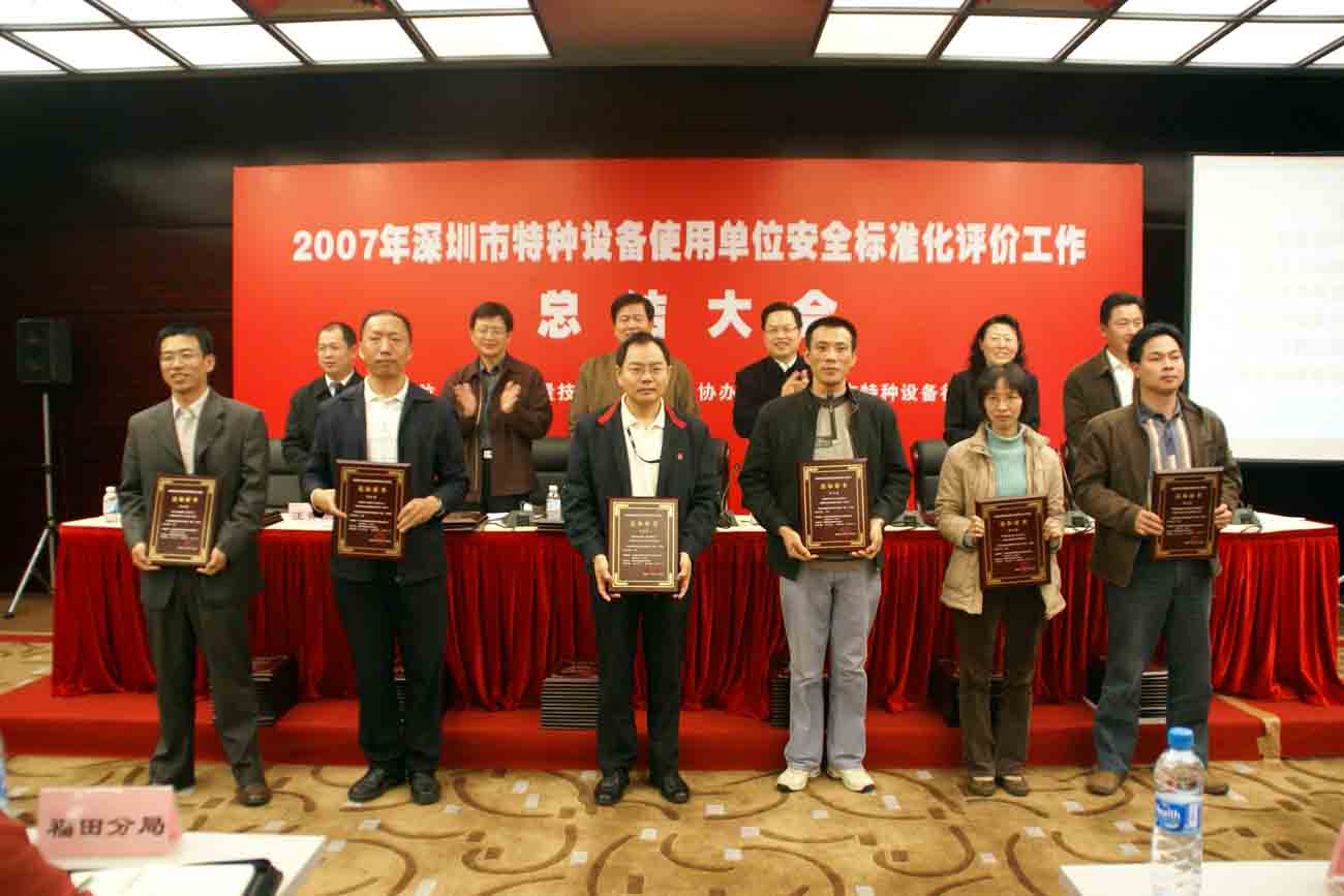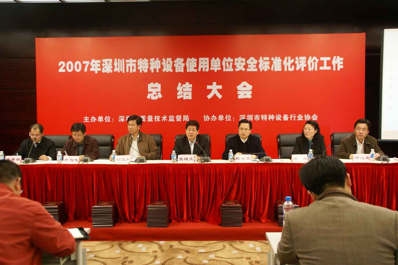 2007年12月26日,市質監局在深圳會展中心召開2007年深圳市特種設備使用單位安全標準化評價工作總結大會。市質監局張綺文局長、程學源副局長到會并講話。市質監局特設處和各分局有關工作人員、專家評價小組組長、市行業協會相關負責人和相關企業負責人共150余人參加了會議。