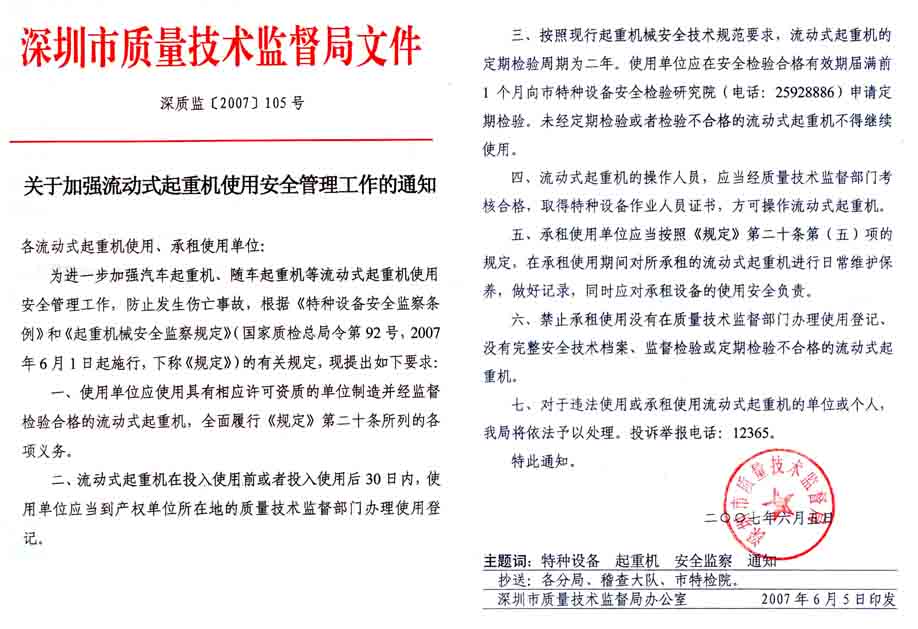 關(guān)于加強流動式起重機使用安全管理工作的通知