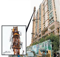 記者看到,這是一棟18層高的居民樓,2層以上的樓面外層墻磚基本鋪設完畢。一座50多米高的塔吊矗立在居民樓前方。塔吊底部附近搭著腳手架,地上還堆滿了沙子和其他建筑材料。記者注意到,和不遠處的另一座塔吊相比,這個塔吊明顯已經“傷筋動骨”。正常的塔吊頂部呈三角形,中間一斷鐵架支撐,兩側有鋼筋拉扯著橫放的鐵架。駕駛室就位于橫放鐵架的一端。記者看到,眼前這座塔吊,駕駛室不見蹤影,長長的橫放“手臂”搭拉下來,看上去搖搖欲墜。