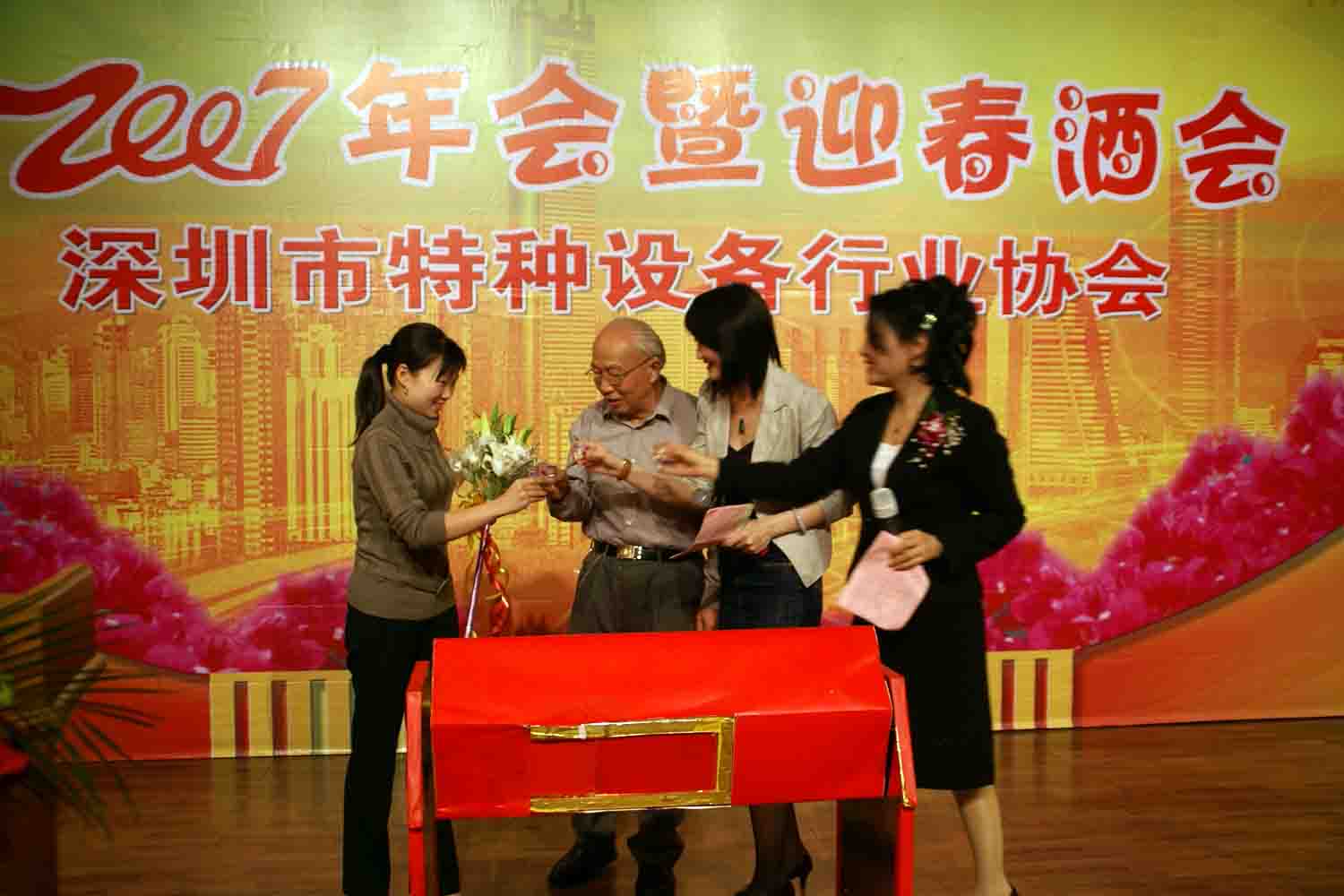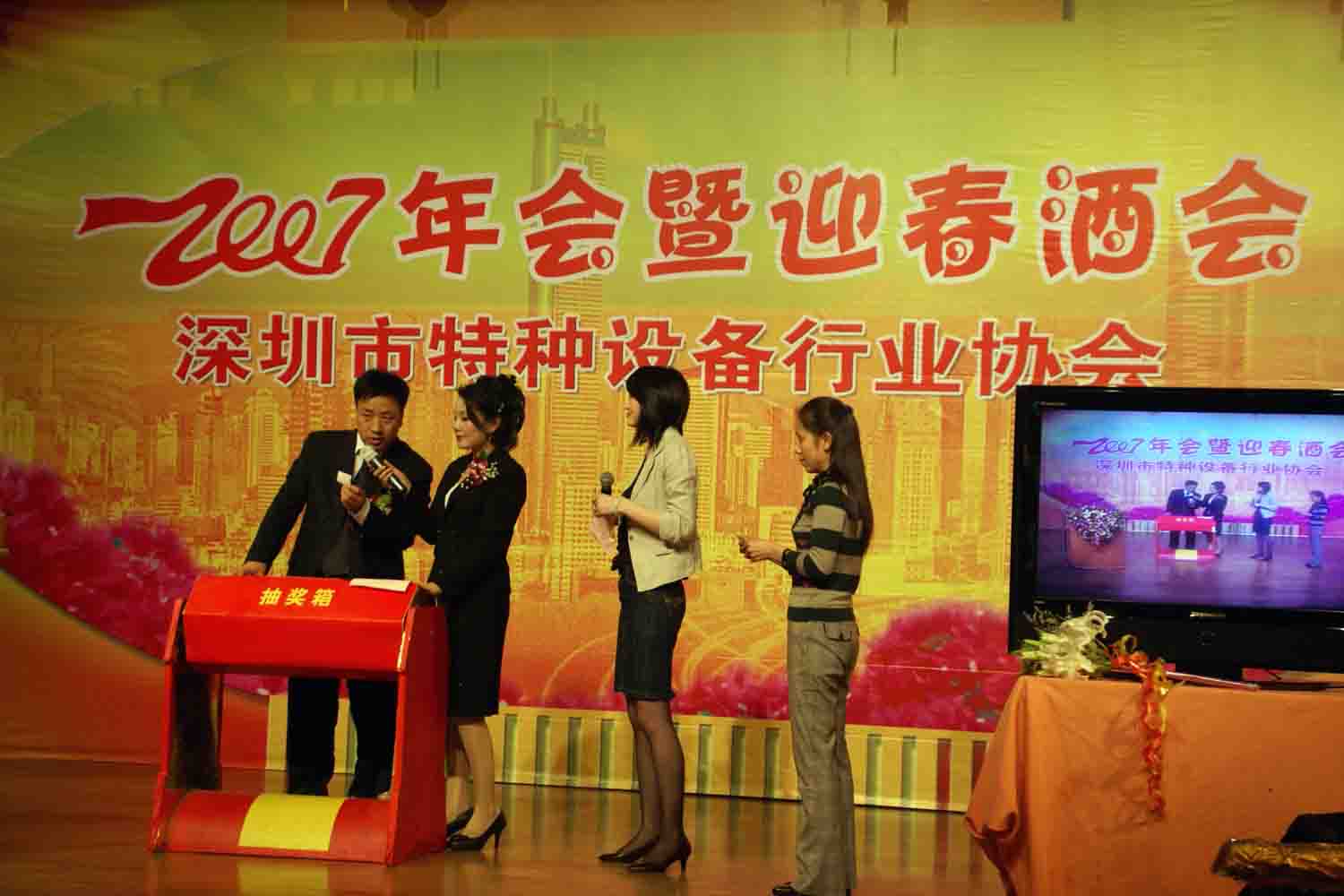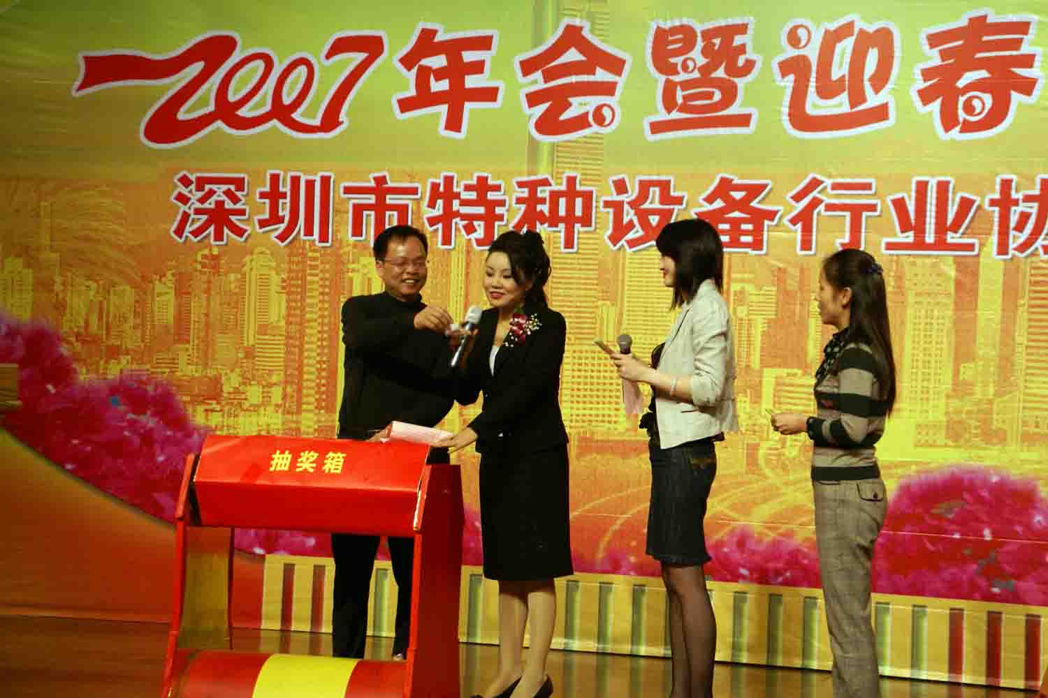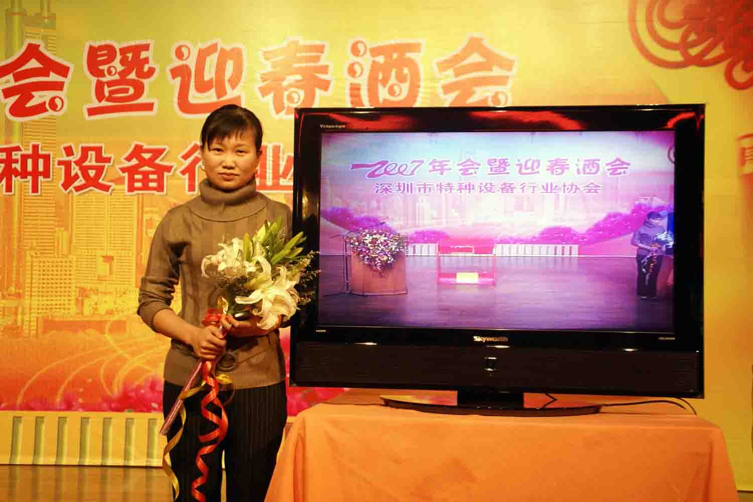 在汪青根會長,郭力宜、鄭中青、郭隆芳、索軍利、蔡衛國副會長,唐紅凱秘書長的祝酒辭中開始了迎春酒會和抽獎活動。幾位會長、副會長作為抽獎嘉賓抽出了100名三等獎;特檢院梁廣熾院長作為抽獎嘉賓抽出了20名二等獎;特設處劉玉歆處長作為抽獎嘉賓抽出了5名一等獎;本次大會的特等獎是協會精心準備的價值9999元的創維46吋高清液晶電視機,當特等獎抽獎嘉賓吳文炳先生(協會高級顧問)在眾人的期待中宣讀出中獎序號為“107”,中獎人—佛山市南海珠江富士電梯公司深圳分公司負責人李奇珍女士在大家的熱烈掌聲中走上主席臺時,整個酒會和抽獎活動達到了高潮,特協2007年會也圓滿結束。