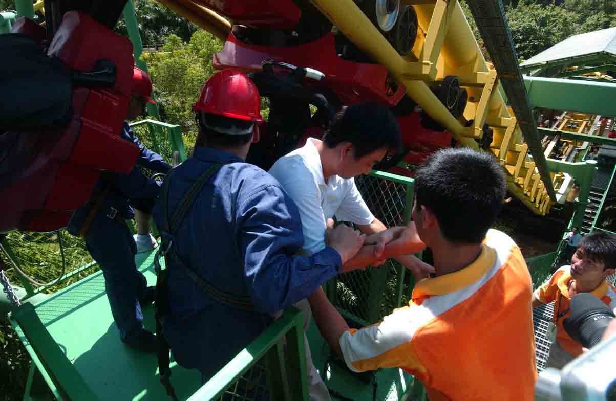 2008年7月3日,歡樂(lè)谷一臺(tái)滿載游客的過(guò)山車(chē)在運(yùn)行過(guò)程中突然出現(xiàn)機(jī)械故障,10多名游客懸停在10多米的高空,個(gè)別游客由于驚嚇過(guò)度出現(xiàn)了昏迷癥狀,情況萬(wàn)分危急。歡樂(lè)谷公司立即啟動(dòng)了應(yīng)急救援預(yù)案,應(yīng)急救援人員隨即趕赴現(xiàn)場(chǎng),將受困游客安全轉(zhuǎn)移到地面。這是發(fā)生在深圳市游樂(lè)設(shè)施應(yīng)急演練現(xiàn)場(chǎng)觀摩會(huì)上的一幕。