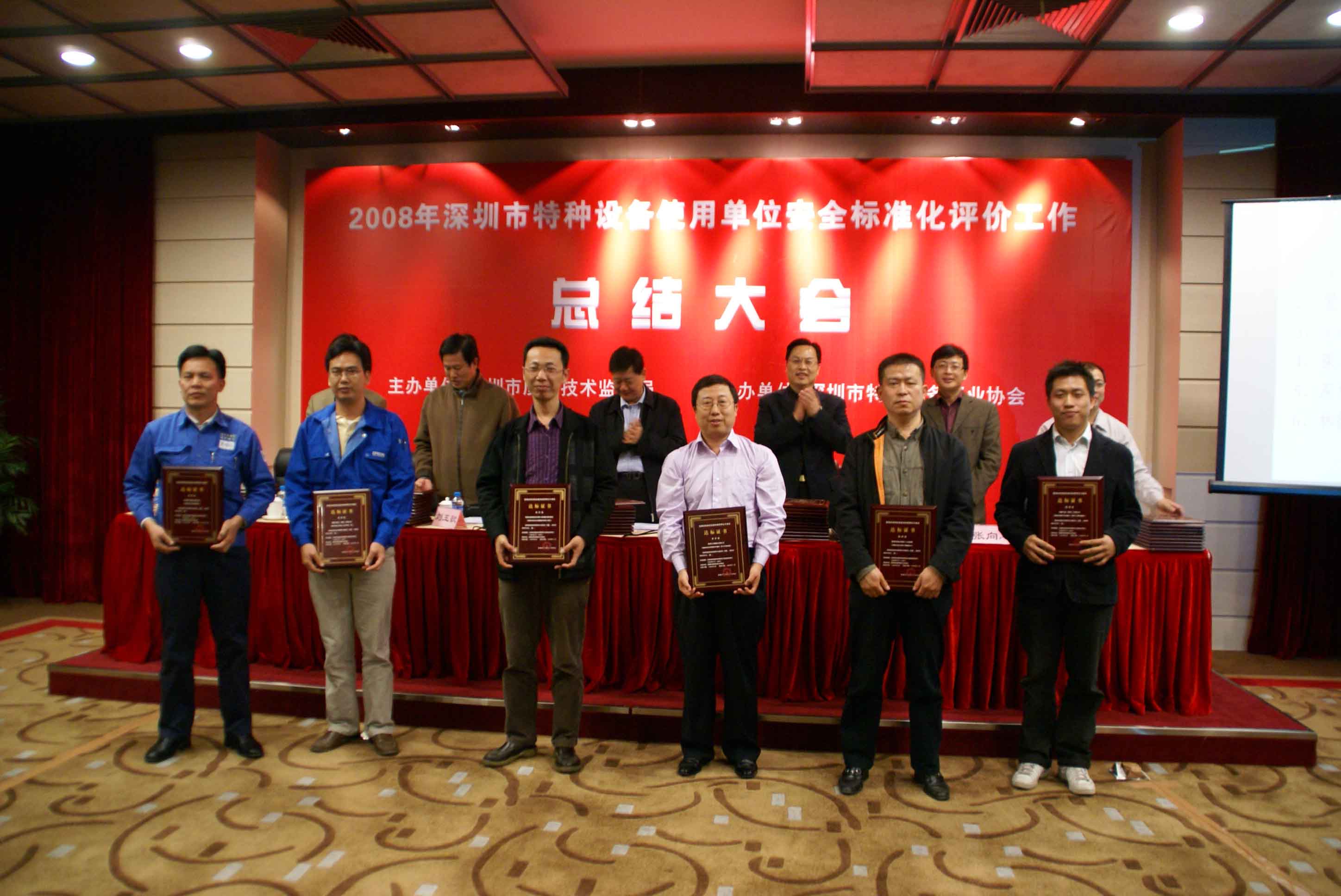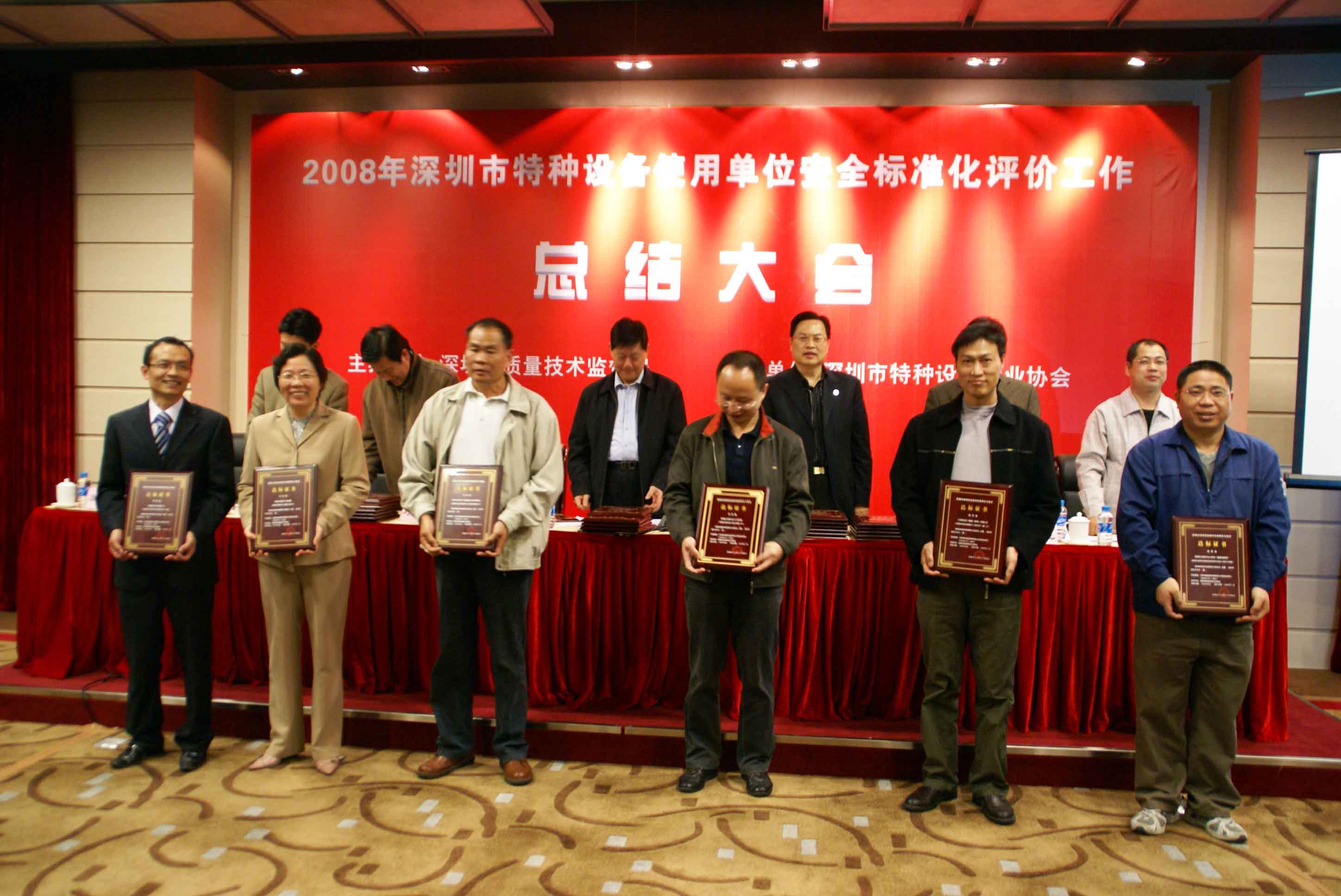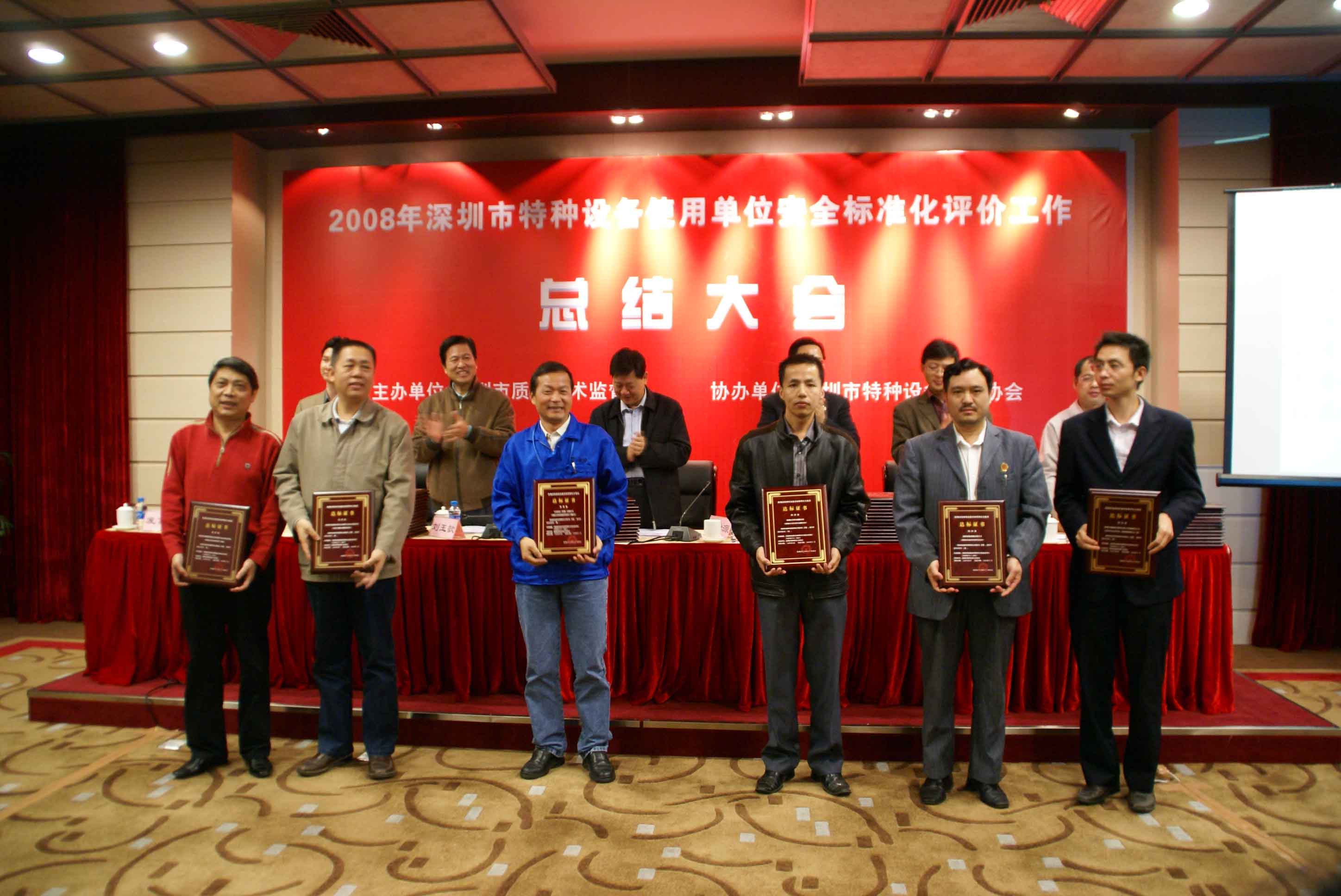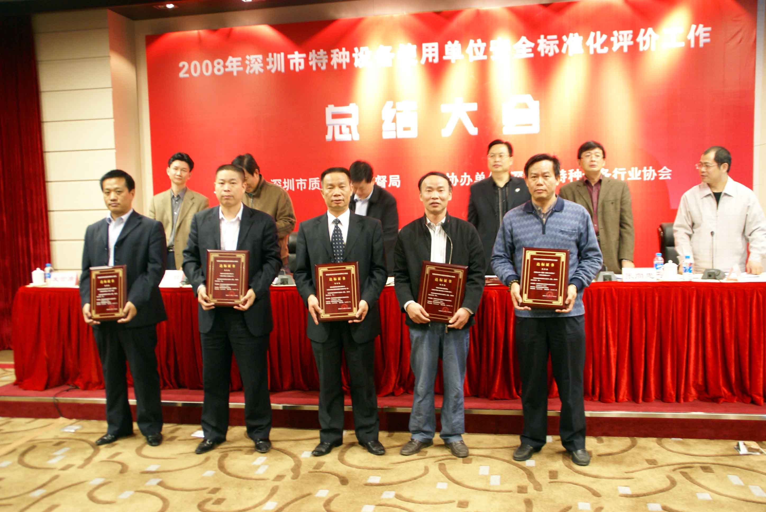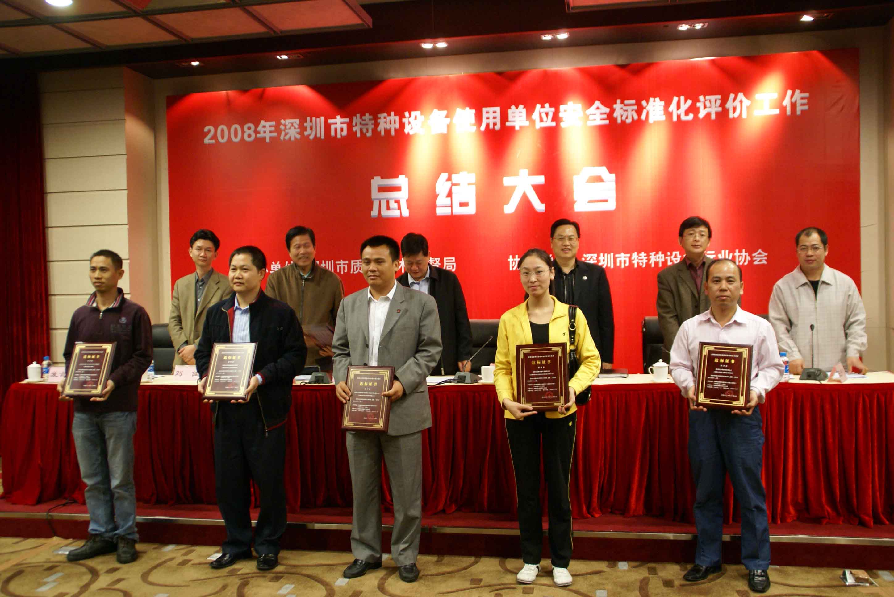會議由市質監局特設處張向忠副處長主持,劉玉歆處長作2008年深圳市特種設備使用單位安全標準化工作總結;會議指出,在市質監局的正確領導下,各分局、市特檢院、市特設協會克服安全形勢嚴峻、工作任務繁重的困難,積極爭取被評價單位的支持,協同作戰,奮力拼搏,提前2個月圓滿完成安全標準評價工作任務,把我市特種設備安全監管工作推上一個新的臺階,成績來自不易。會議提出明年特種設備安全標準化評價工作目標為爭取明年再完成80家企業安全標準化評價工作任務,包括對評價達標滿3年的企業進行復評,以及對新增重點監控單位和重點場所進行初評。深圳市寶安區公園管理處陳友亮主任和深圳市廣前電力有限公司陳秋輝經理作為使用單位代表發言。質監局領導向2008年通過特種設備使用單位安全標準化評價單位發放達標等級證書。