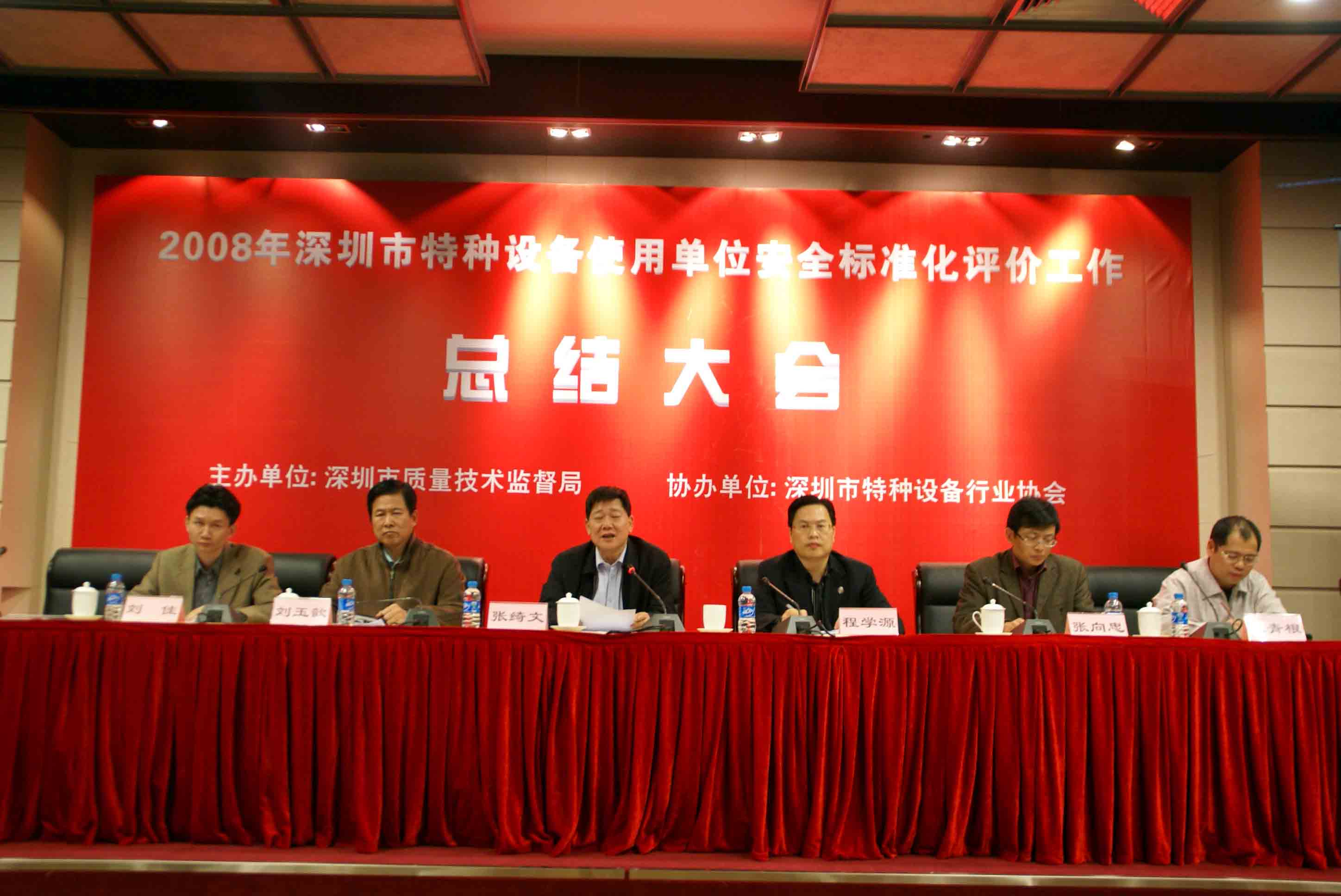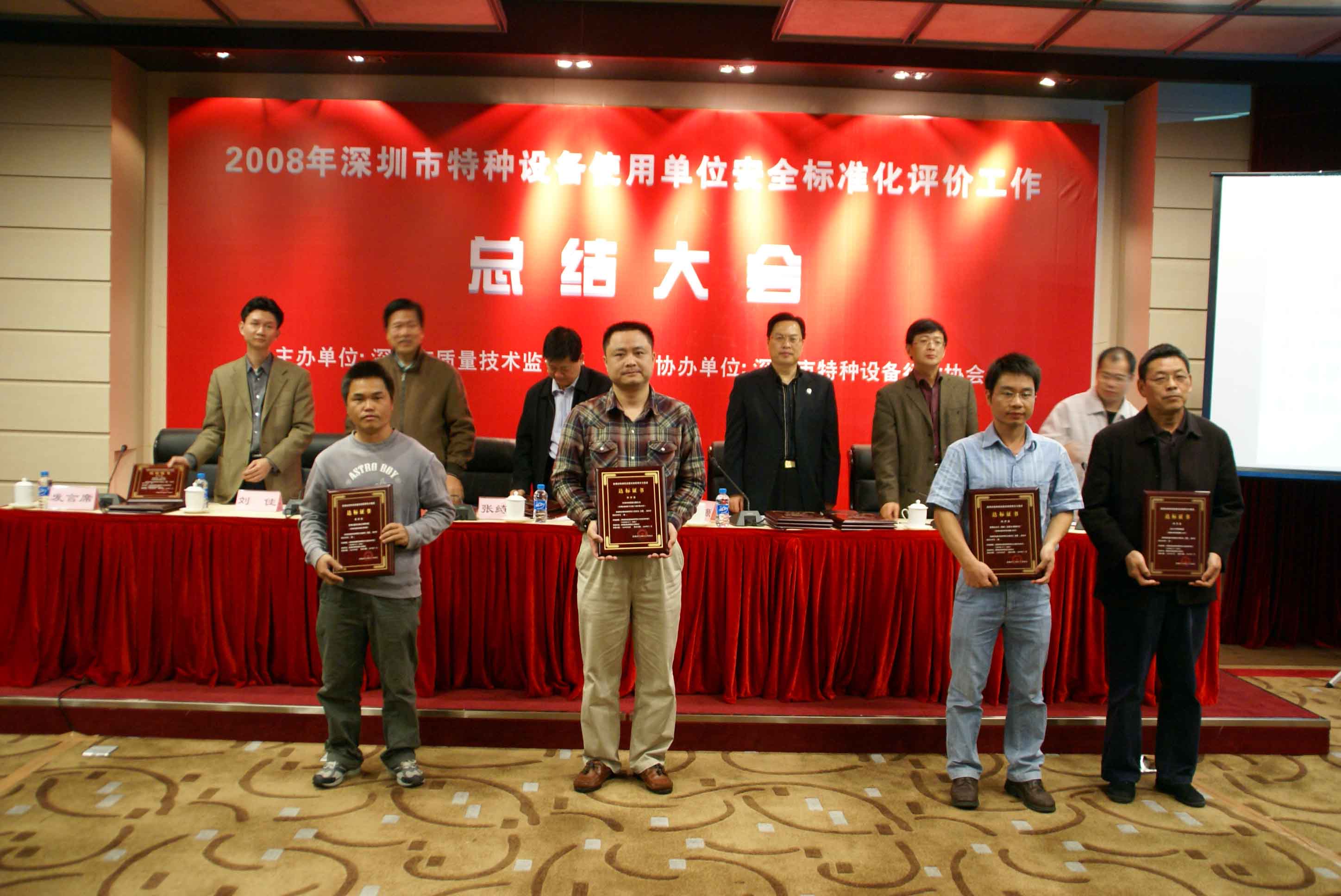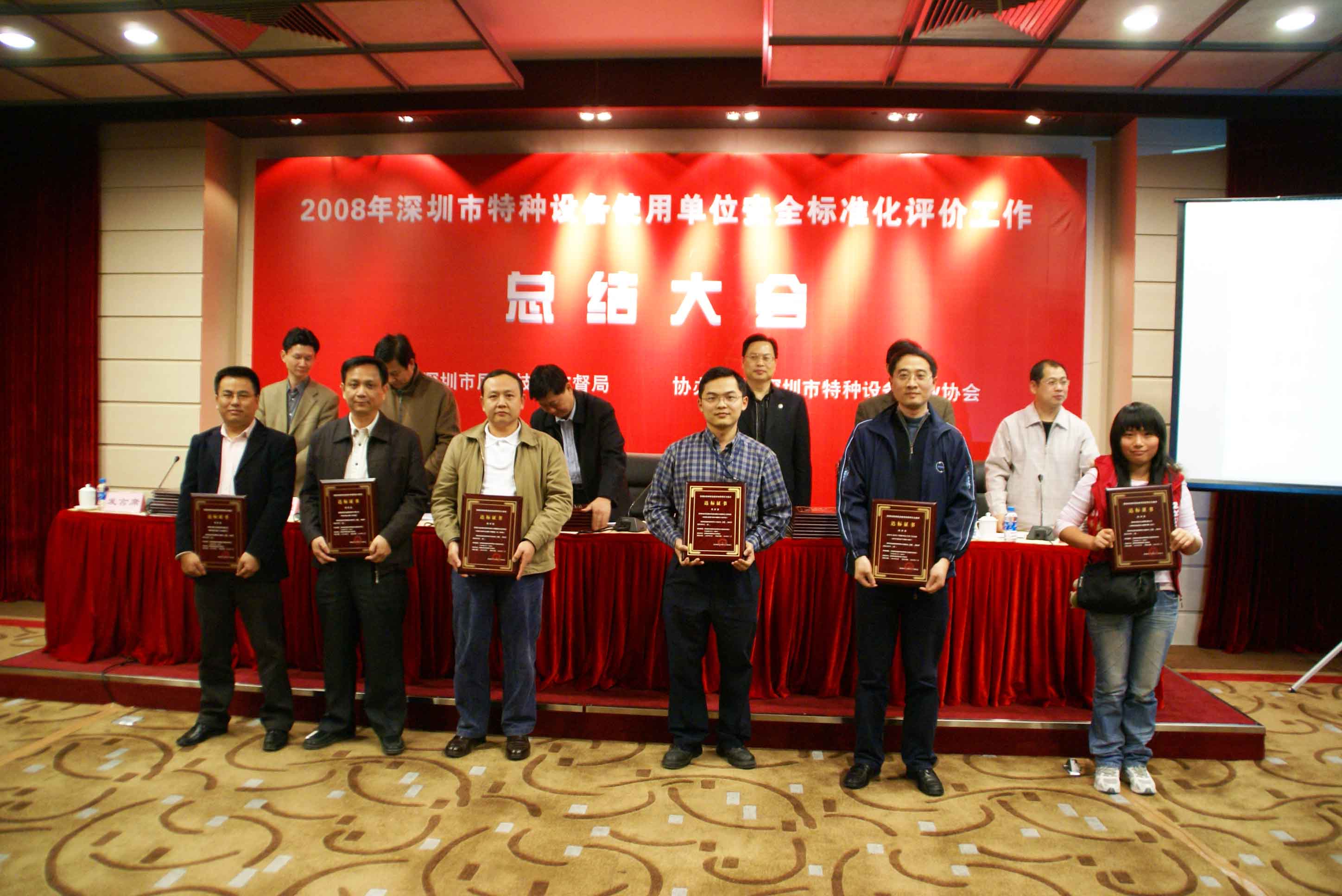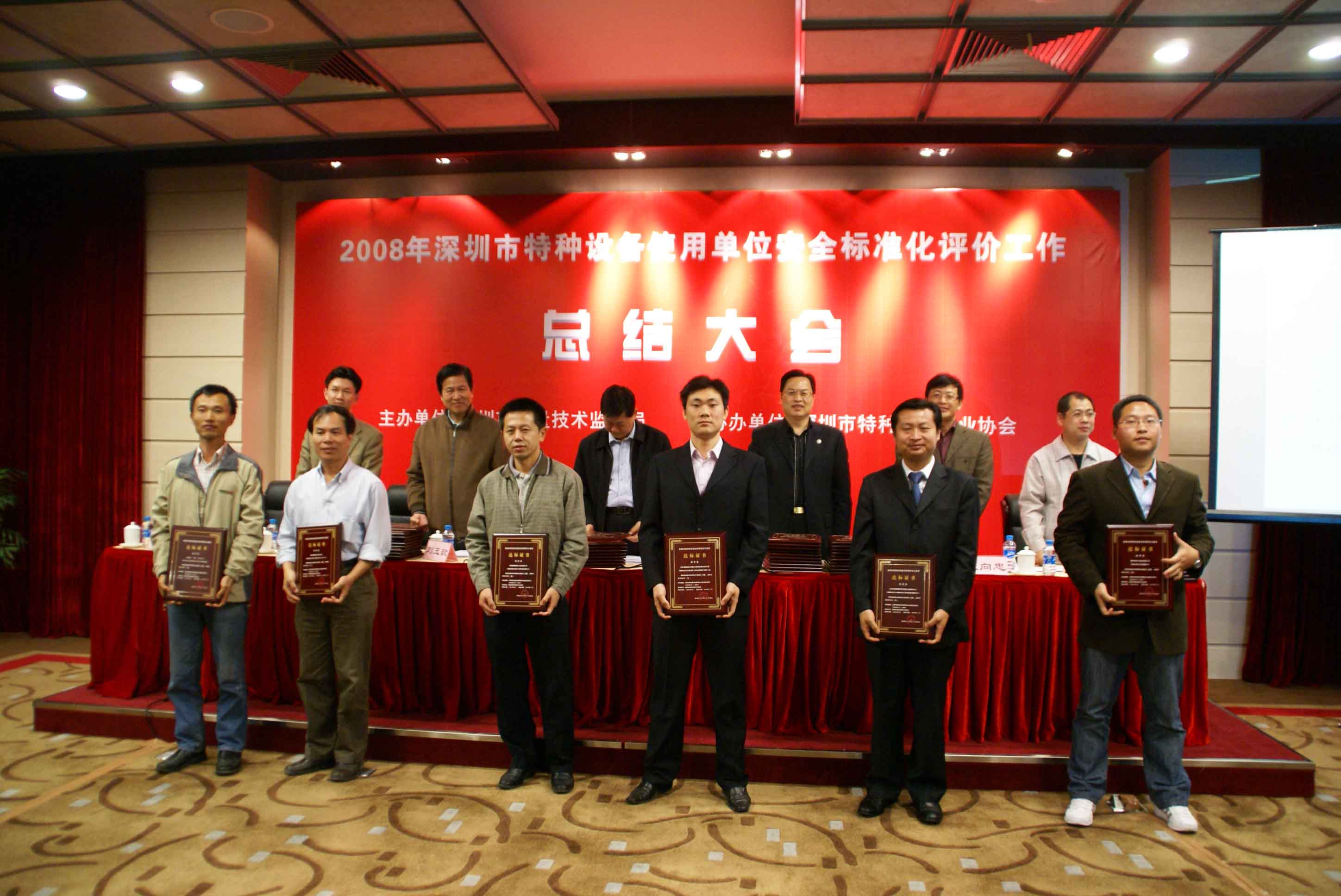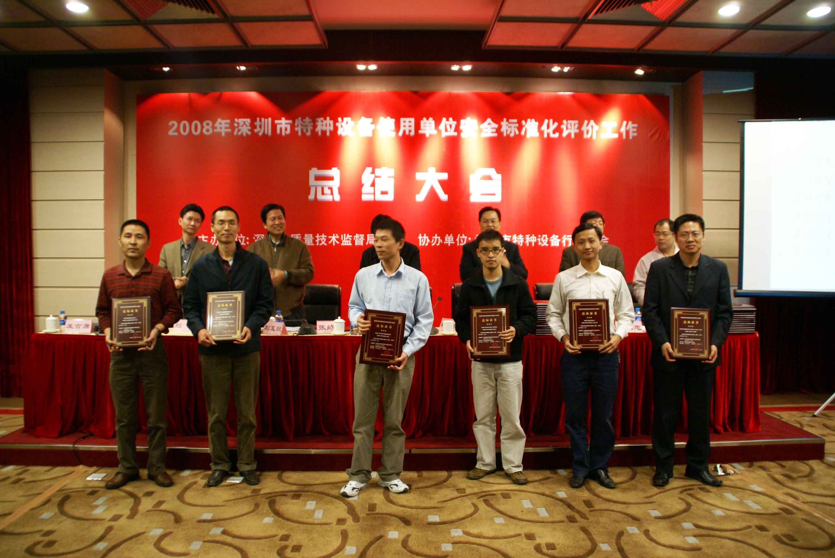 會議由市質監局特設處張向忠副處長主持,劉玉歆處長作2008年深圳市特種設備使用單位安全標準化工作總結;會議指出,在市質監局的正確領導下,各分局、市特檢院、市特設協會克服安全形勢嚴峻、工作任務繁重的困難,積極爭取被評價單位的支持,協同作戰,奮力拼搏,提前2個月圓滿完成安全標準評價工作任務,把我市特種設備安全監管工作推上一個新的臺階,成績來自不易。會議提出明年特種設備安全標準化評價工作目標為爭取明年再完成80家企業安全標準化評價工作任務,包括對評價達標滿3年的企業進行復評,以及對新增重點監控單位和重點場所進行初評。深圳市寶安區公園管理處陳友亮主任和深圳市廣前電力有限公司陳秋輝經理作為使用單位代表發言。質監局領導向2008年通過特種設備使用單位安全標準化評價單位發放達標等級證書。