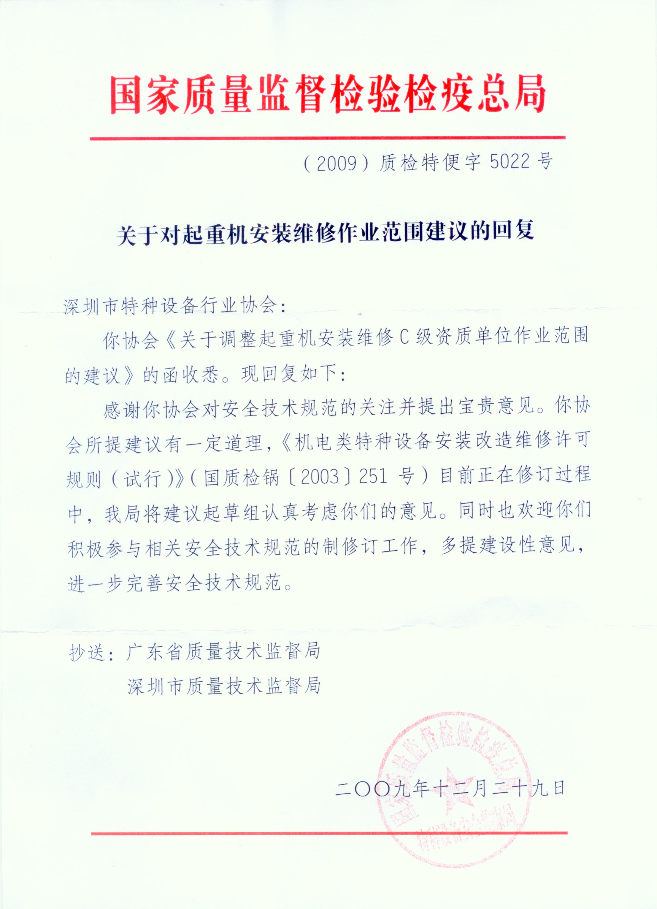 按照《機(jī)電類特種設(shè)備安裝改造維修許可規(guī)則(試行)》的通知》(國(guó)質(zhì)檢鍋[2003]251號(hào))的相關(guān)規(guī)定,取得橋、門式起重機(jī)安裝維修C級(jí)資質(zhì)單位可以安裝、維修20噸及以下橋、門式起重機(jī)械的電動(dòng)葫蘆,不能安裝維修同類型獨(dú)立的電動(dòng)葫蘆。目前大部分起重機(jī)維保單位均受制于此規(guī)定,業(yè)務(wù)難以發(fā)展壯大,行業(yè)反映強(qiáng)烈。有鑒于此,在部分起重機(jī)維保單位的提議下,協(xié)會(huì)對(duì)起重機(jī)維保單位提供的聯(lián)文進(jìn)行審慎推敲,然后與十家起重機(jī)維保單位聯(lián)名向國(guó)家質(zhì)量監(jiān)督檢驗(yàn)檢疫總局特種設(shè)備安全監(jiān)察局、廣東省質(zhì)量技術(shù)監(jiān)督局、深圳市市場(chǎng)監(jiān)督管理局遞交了《關(guān)于調(diào)整起重機(jī)安裝維修C級(jí)資質(zhì)單位作業(yè)范圍的建議》。近日,協(xié)會(huì)收到國(guó)家質(zhì)監(jiān)總局的回復(fù),全文刊登如下: