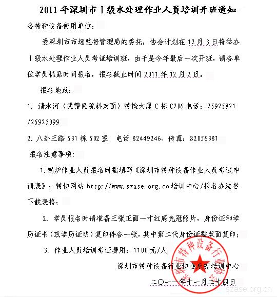 2011年深圳市Ⅰ級(jí)水處理作業(yè)人員培訓(xùn)開(kāi)班通知