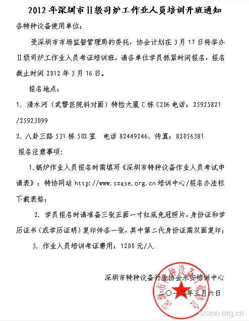 2012年深圳市Ⅱ級司爐工作業人員培訓開班通知